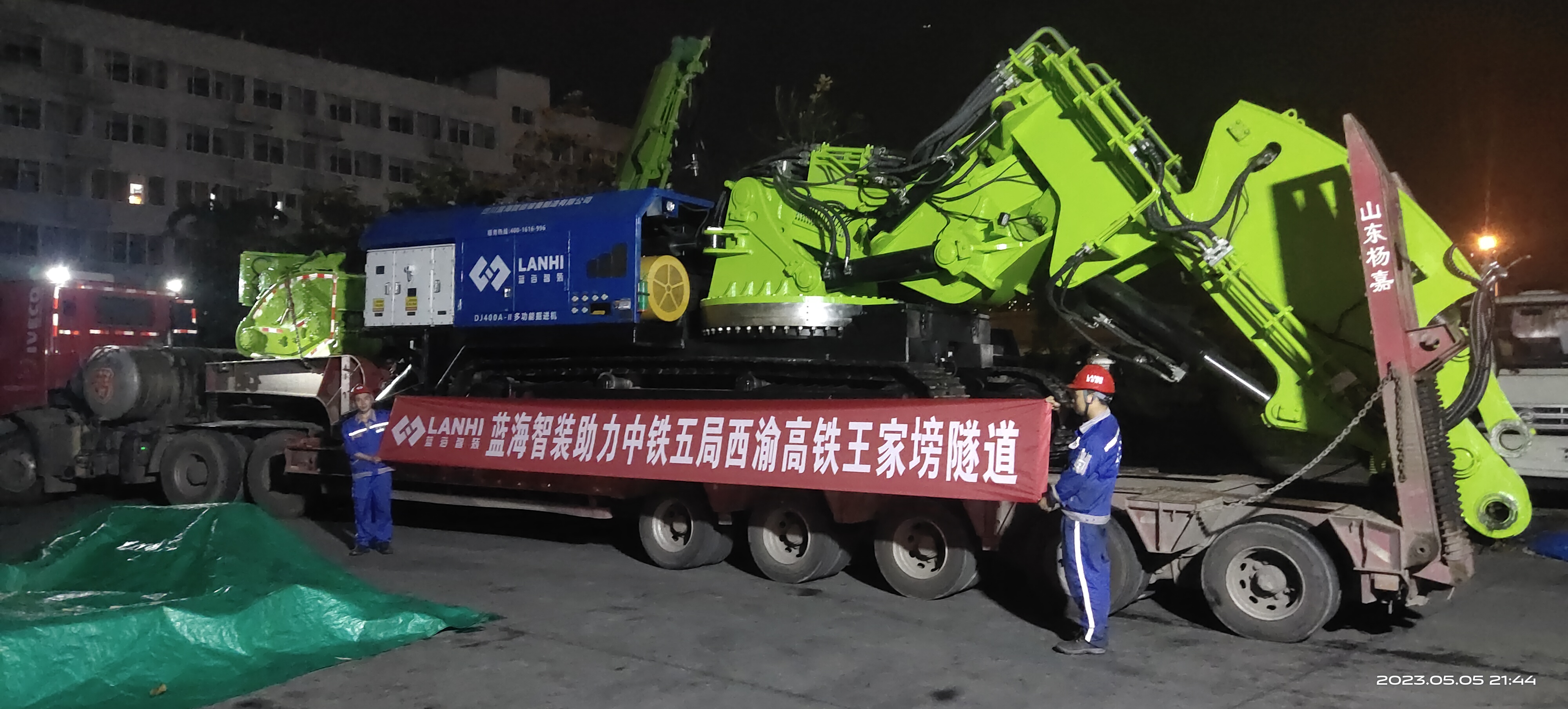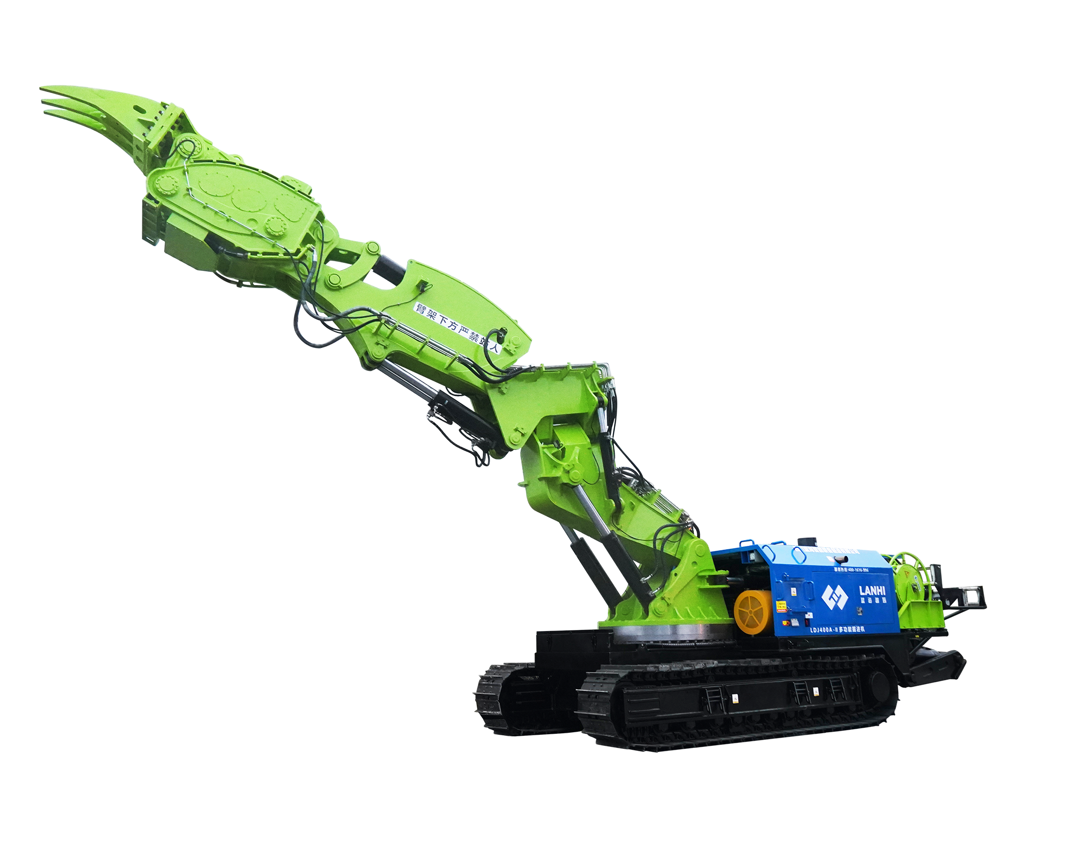 藍(lán)海智裝LDJ400系列多功能掘進(jìn)機(jī)是一款運(yùn)用于隧道非爆開(kāi)挖的專(zhuān)用設(shè)備,主要利用工作部的高頻錘或破碎錘沖擊破巖、斗齒或釬桿楔入圍巖中的扳撬破巖和利用圍巖下方的臨空面重力作用自動(dòng)破巖(高頻錘主要針對(duì)40MPa以下巖石;硬度更高、發(fā)育不好的巖石采用破碎錘施工)。采用本地控制+無(wú)線遙控控制方式,能適應(yīng)6~9.5米隧道開(kāi)挖,集高頻破巖、軟土快挖、輪廓修整、噴霧除塵等功能于一體,適用于限制爆破地段(如機(jī)場(chǎng)、居民聚集區(qū)和野生動(dòng)物保護(hù)區(qū)等)的施工,適應(yīng)性強(qiáng),滿足多類(lèi)圍巖施工,減少超欠挖、塌方等情況發(fā)生。