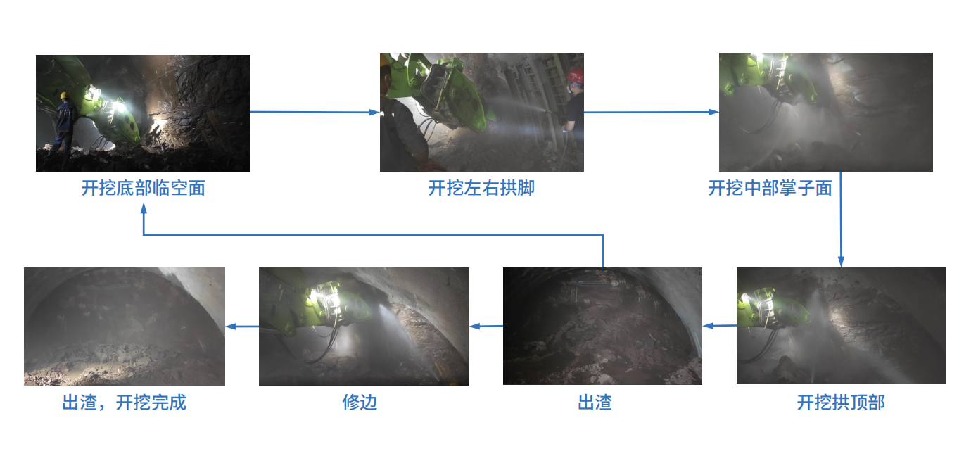 4、開挖拱頂,平行出渣:采用平行出渣方式(開挖作業(yè)與出渣同時進(jìn)行,大幅縮短施工時間,提高施工效率)。
